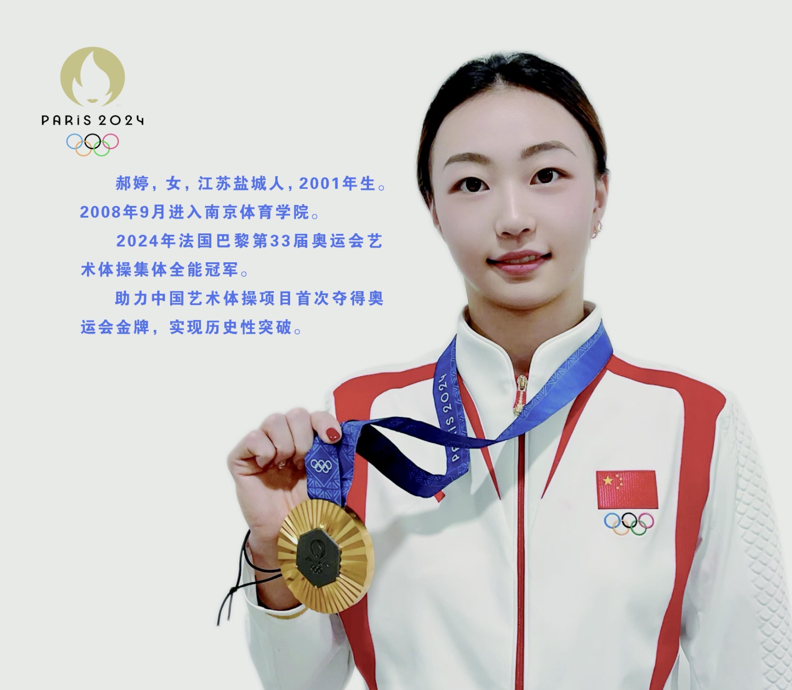 郝婷,2001年出生,江苏盐城人,7岁开始练习艺术体操,8岁入选江苏省体校,11岁进入江苏省艺术体操队进行专业训练。第十四届全运会艺术体操集体全能金牌;2020东京奥运会艺术体操集体全能第四名;2023年第40届世界艺术体操锦标赛五圈单项金牌,实现世锦赛金牌“零的突破”;2024年巴黎奥运会艺术体操集体全能金牌,这也是中国艺术体操队史上首枚奥运会金牌。